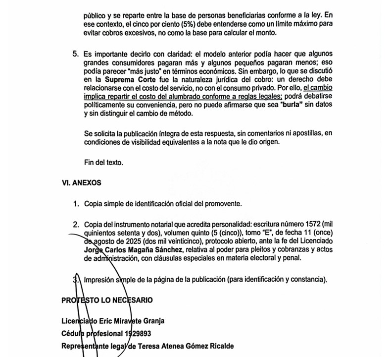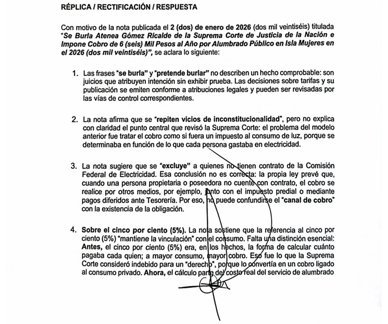 CANCÚN, 8 de enero.- Con motivo de la nota publicada el 2 de enero de 2026, titulada “Se burla Atenea Gómez Ricalde de la Suprema Corte de Justicia de la Nación e impone cobro de 6 mil pesos al año por alumbrado público en Isla Mujeres en el 2026″, la presidenta municipal de Isla Mujeres, a través de su representante legal, Eric Miravete Granja, solicitó la publicación del siguiente escrito en ejercicio de su derecho de réplica, que a continuación se reproduce de manera textual:
