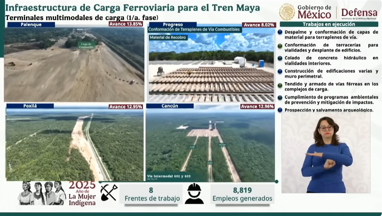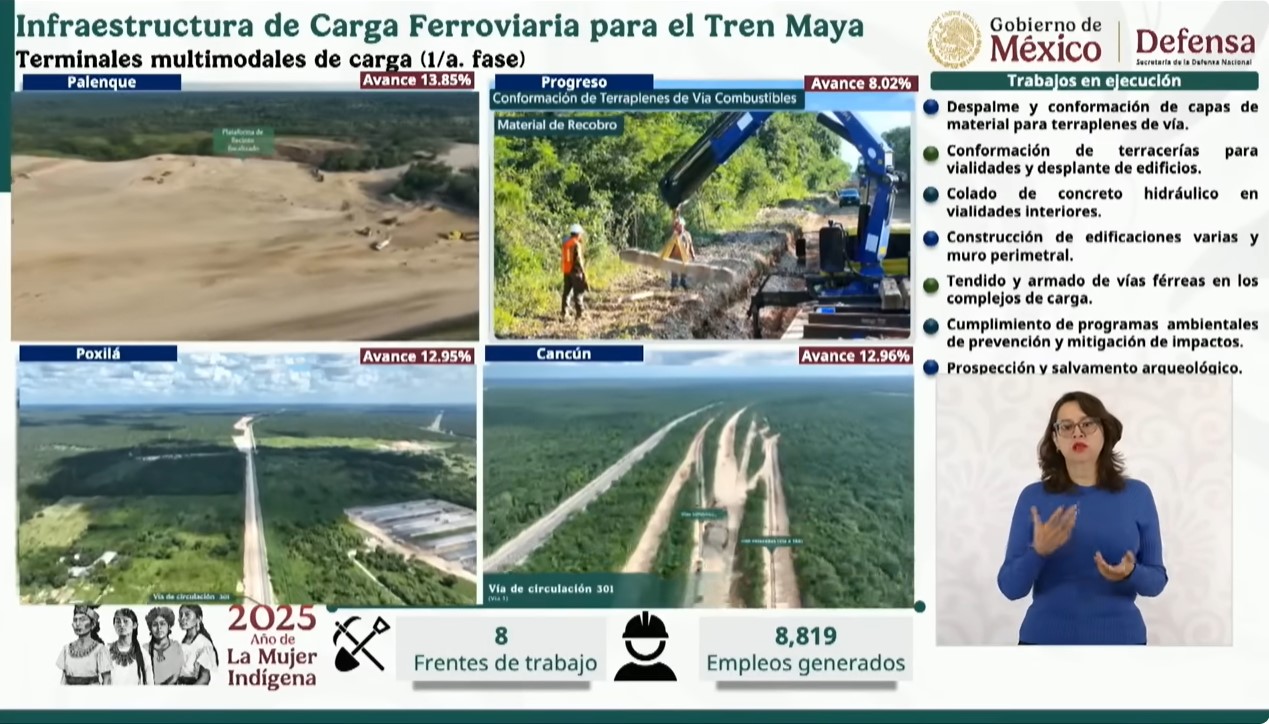 Durante su intervención en la conferencia de la presidenta Claudia Sheinbaum el miércoles, informó que los trabajos se encuentran en su etapa inicial, que consiste en despalme y conformación de capas de materiales para terraplenes de vía; conformación de terracerías para vialidades internas y desplante de edificios técnicos y administrativos; prospección y salvamento arqueológico; y continuarán con colado de concreto hidráulico en vialidades interiores; construcción de edificaciones y muro perimetral; y tendido y armado de vías férreas en los complejos de carga.