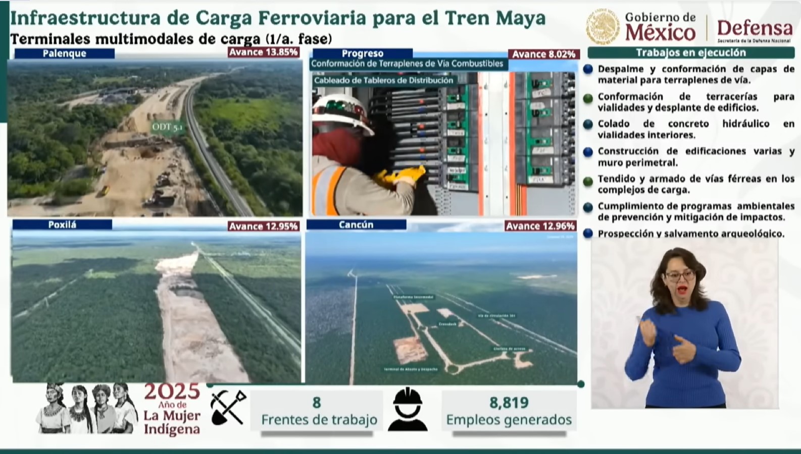 Durante su intervención en la conferencia de la presidenta Claudia Sheinbaum el miércoles, informó que los trabajos se encuentran en su etapa inicial, que consiste en despalme y conformación de capas de materiales para terraplenes de vía; conformación de terracerías para vialidades internas y desplante de edificios técnicos y administrativos; prospección y salvamento arqueológico; y continuarán con colado de concreto hidráulico en vialidades interiores; construcción de edificaciones y muro perimetral; y tendido y armado de vías férreas en los complejos de carga.