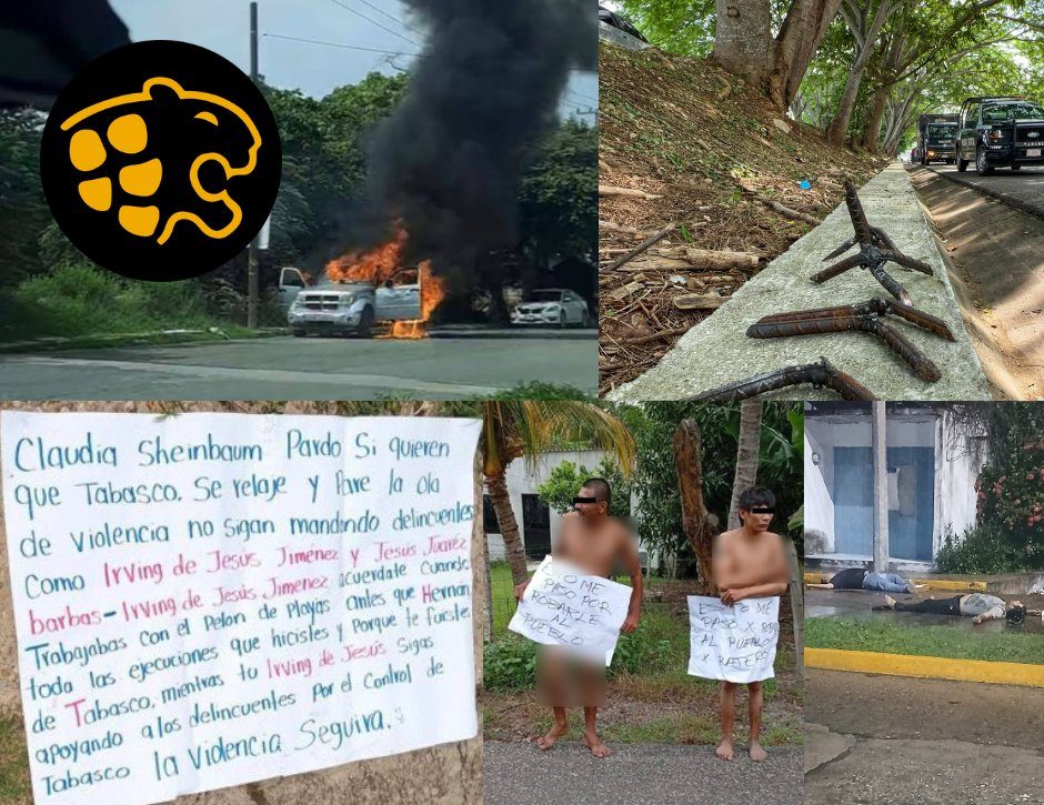 Durante la visita de la presidenta Claudia Sheinbaum Pardo por Tabasco, se dieron algunos brotes de violencia en diversos puntos de la capital Villahermosa, como una narcomanta dirigida a ella, en la que un grupo criminal acusó a mandos policiacos de estar coludidos con la delincuencia.