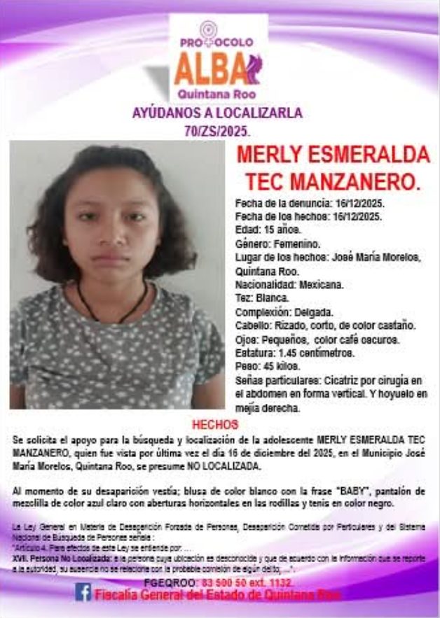 El primer caso corresponde a Merly Esmeralda Tec Manzanero, adolescente de 15 años de edad, reportada como no localizada desde el martes 16 de diciembre de 2025, de acuerdo con información oficial emitida mediante el Protocolo Alba y la Alerta Amber en Quintana Roo.