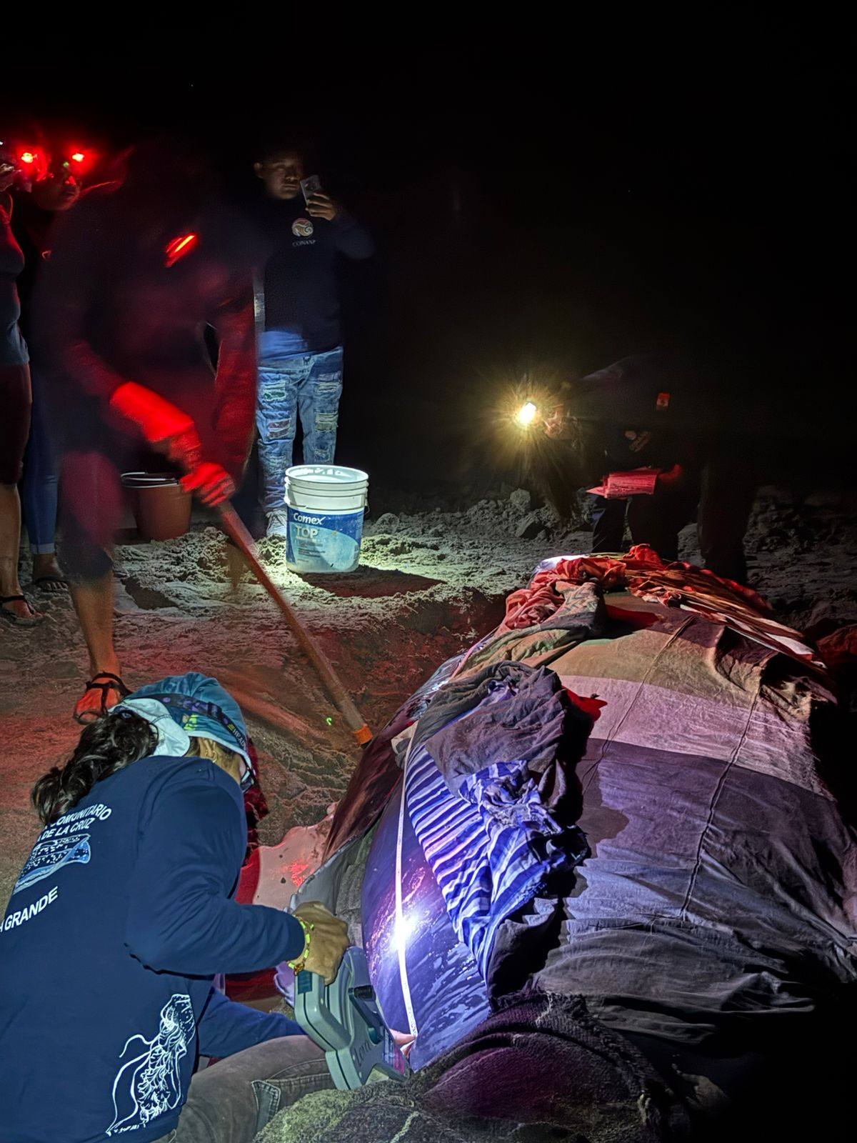 El ejemplar, un ballenato de 4.60 metros de longitud y con una aleta caudal de 1.36 metros, fue detectado durante recorridos nocturnos de monitoreo de tortugas marinas que realiza de manera permanente el personal del santuario.