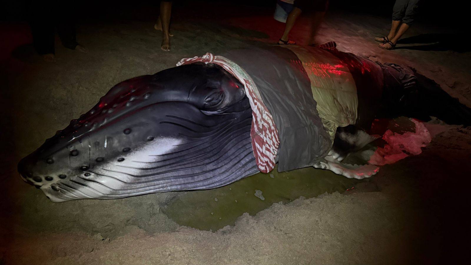 El ejemplar, un ballenato de 4.60 metros de longitud y con una aleta caudal de 1.36 metros, fue detectado durante recorridos nocturnos de monitoreo de tortugas marinas que realiza de manera permanente el personal del santuario.