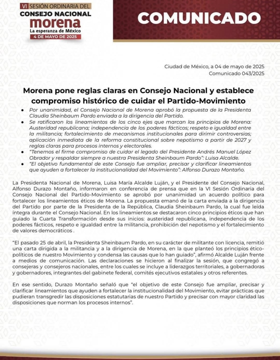 Consideró que esto es solamente para mantener la unidad entre las bases e ir más fuertes a la contienda de 2027, donde anticipan, obtendrán de nueva cuenta carro completo, por lo que dijo, la solicitud de la mandataria federal obedece a poner los pies sobre la tierra, a continuar trabajando al ras del piso y a no olvidar que el poder es efímero y no hay que acostumbrarse a él, así como erradicar el nepotismo y la corrupción.