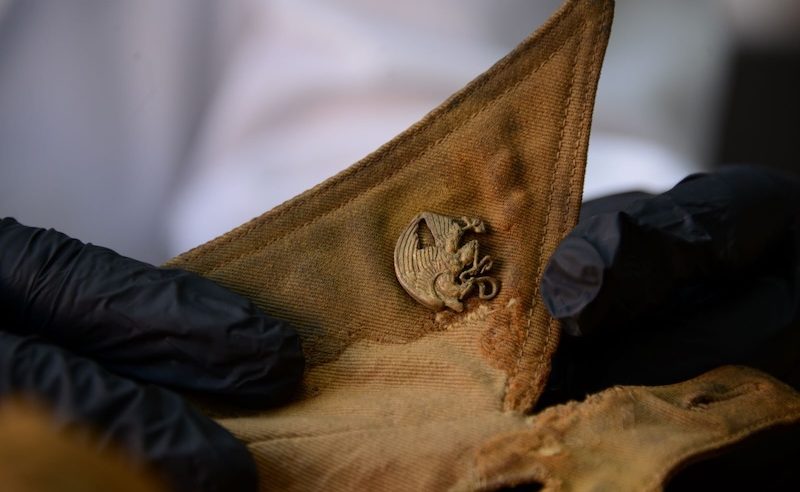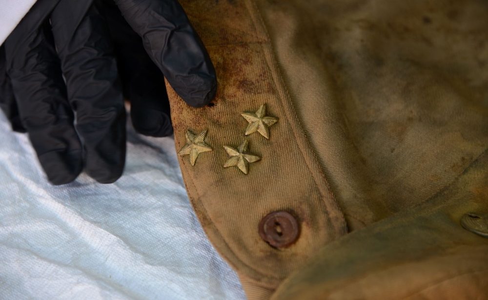 La ropa presentaba una decoloración importante, causada por las condiciones ambientales extremas propias de la entidad; rigidez y resequedad, debilitamiento de las fibras, manchas causadas por el paso del tiempo y el contexto de enterramiento; corrosión de las insignias metálicas, resquebrajamiento de la tela; faltantes en la camisa, principalmente del cuello y los hombros, así como roturas y desgarres.
