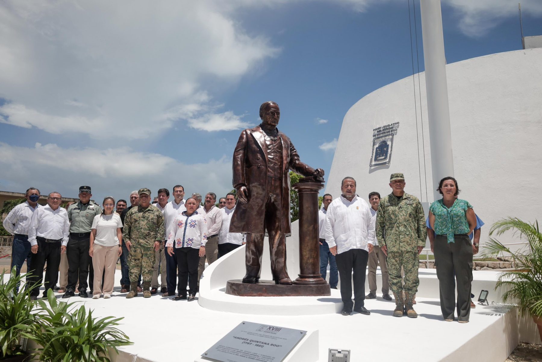 CHETUMAL, 29 de agosto.- En una ceremonia celebrada al mediodía de este viernes, la XVIII Legislatura del Estado inauguró la reinstalación de la estatua de Andrés Quintana Roo y del asta bandera en la Plaza Cívica del Palacio Legislativo, tras darse marcha atrás a su retiro durante la legislatura anterior para un proyecto de construcción de una cafetería.