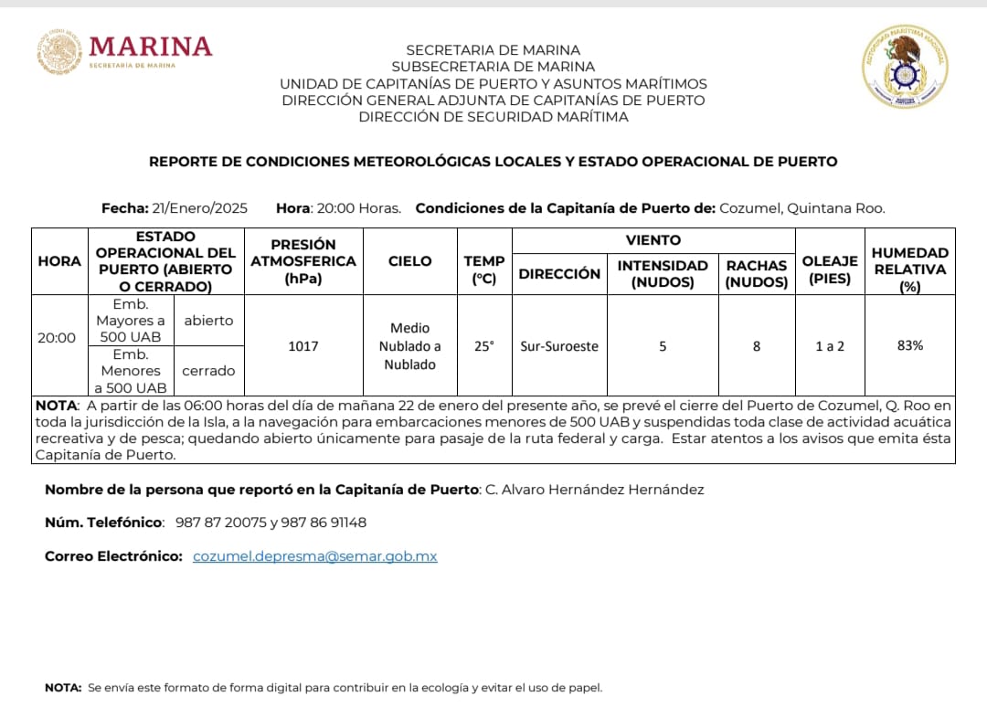 El. Puerto se encuentra cerrado en toda la jurisdicción de Cozumel para las embarcaciones de menos de 15 metros de eslora y la realización de actividades acuáticas recreativas, por lo que se recomienda mantenerse atentos de las condiciones climáticas en el área del pronóstico por la temporada de Frentes Fríos.