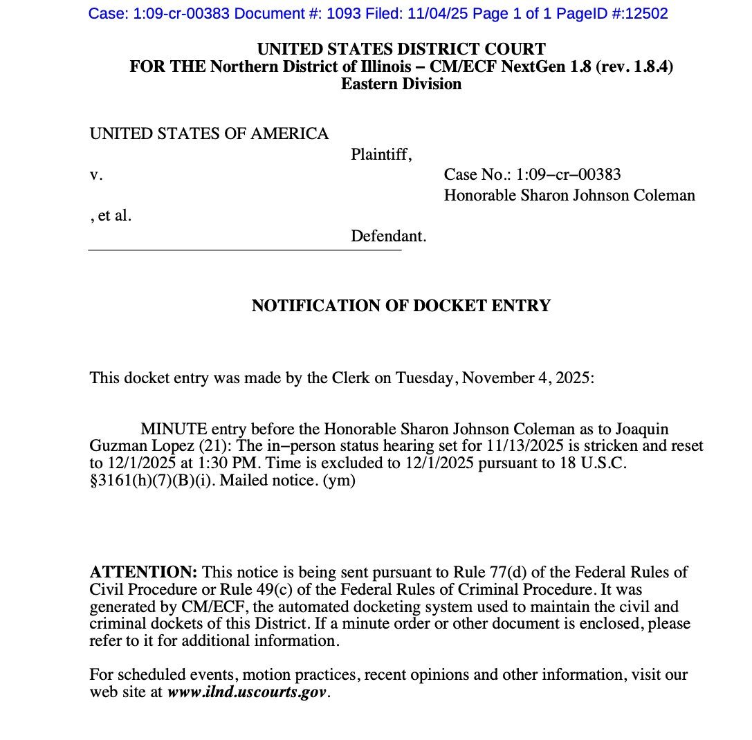 La juez que supervisa el caso, Sharon Johnson Coleman, indicó en un documento publicado este lunes 10 de noviembre que vuelve a posponer la vista para Guzmán, que estaba programada para este jueves en un tribunal federal de Chicago.