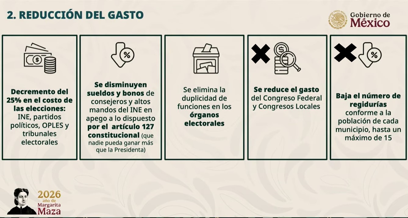 La propuesta que Sheinbaum expuso el 25 de febrero incluía en su punto 2 las propuestas para la reducción del gasto en asuntos electorales, donde al costo de las elecciones sumó las de bajar el número de regidurías de los ayuntamientos conforme a la población de cada municipio, hasta un máximo de 15.