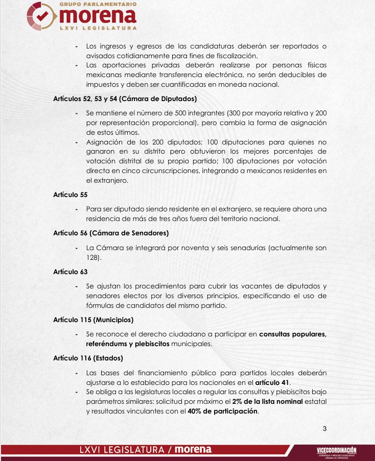 Si va recorte de senadores pluris, cambio de elección de diputaciones federales, eliminación del PREP, reducción de financiamiento público y tiempos en radio y televisión para partidos políticos, regulación de IA y controles de financiamiento privado y fiscalización