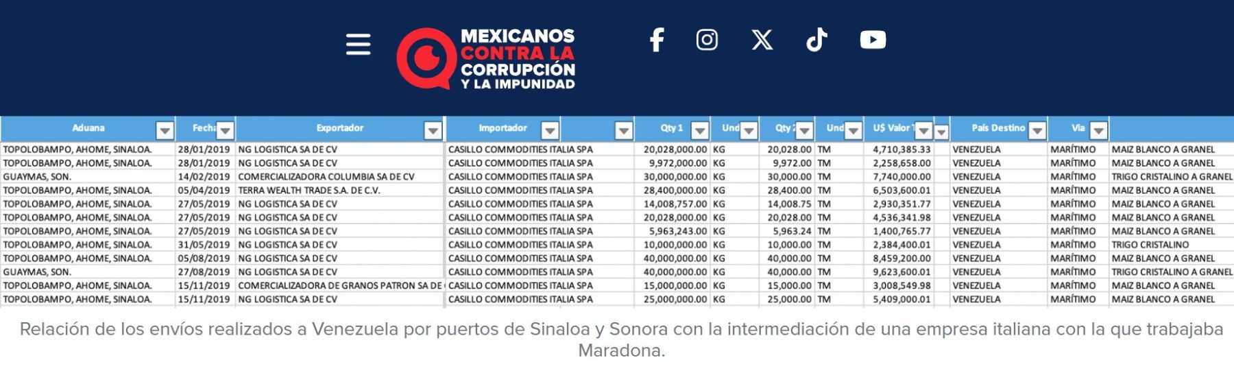 Casillo Commodities -para quien trabajaba Maradona-, continuó realizando operaciones desde los puertos de Topolobampo, Sinaloa, y Guaymas, en Sonora.