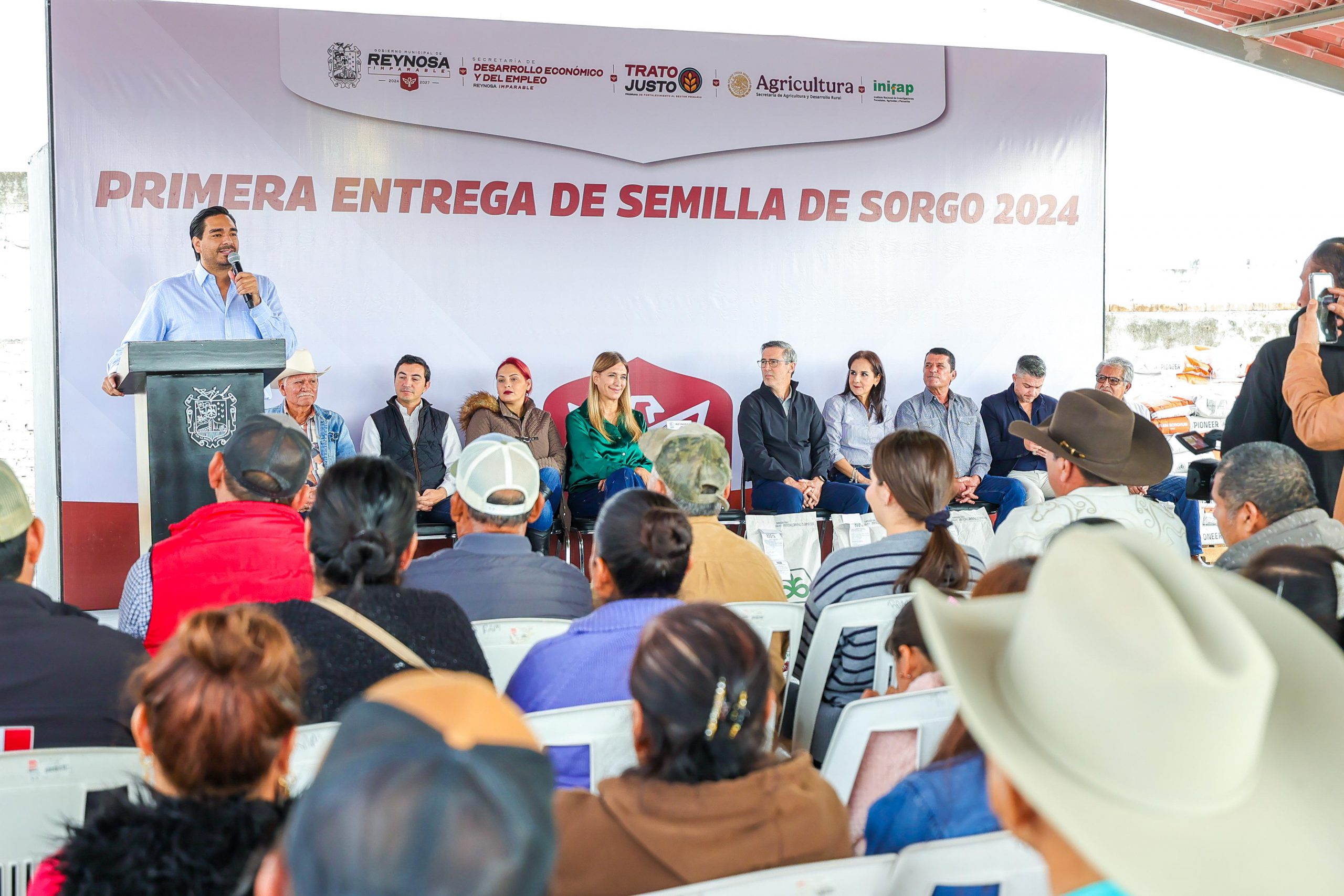 La Primera Entrega de Semilla de Sorgo del Programa Trato Justo fue presentada por el Secretario de Desarrollo Económico y del Empleo, Mauricio Treviño Garza, y participaron Héctor Alejandro Olivares Zavala, Secretario de Bienestar Social; Gumaro Ramírez Franco, Técnico de la Secretaría de Agricultura y Desarrollo Rural del Gobierno de la República, y Jorge Eduardo Gómez Flores, Regidor de la Comisión de Desarrollo Rural del Cabildo de Reynosa.