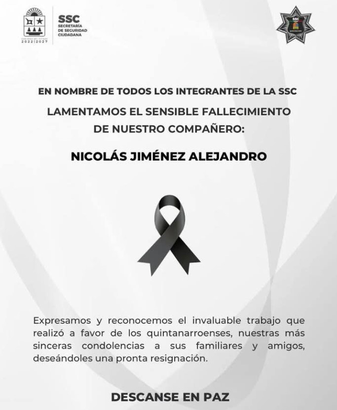 Por su parte, los integrantes de la SSC lamentaron en una esquela la muerte de su compañero, en la que también expresaron su reconocimiento a la invaluable labor que realizó a favor de los quintanarroenses, con sus condolencias para familiares y amigos.