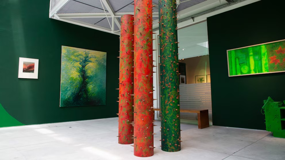 En la sala se erigen unas instalaciones de Uriburu, que como en un Palo Borracho despliegan sus púas en una especie de revancha de la naturaleza que, de lo industrial, se metamorfosea hacia una forma primigenia.