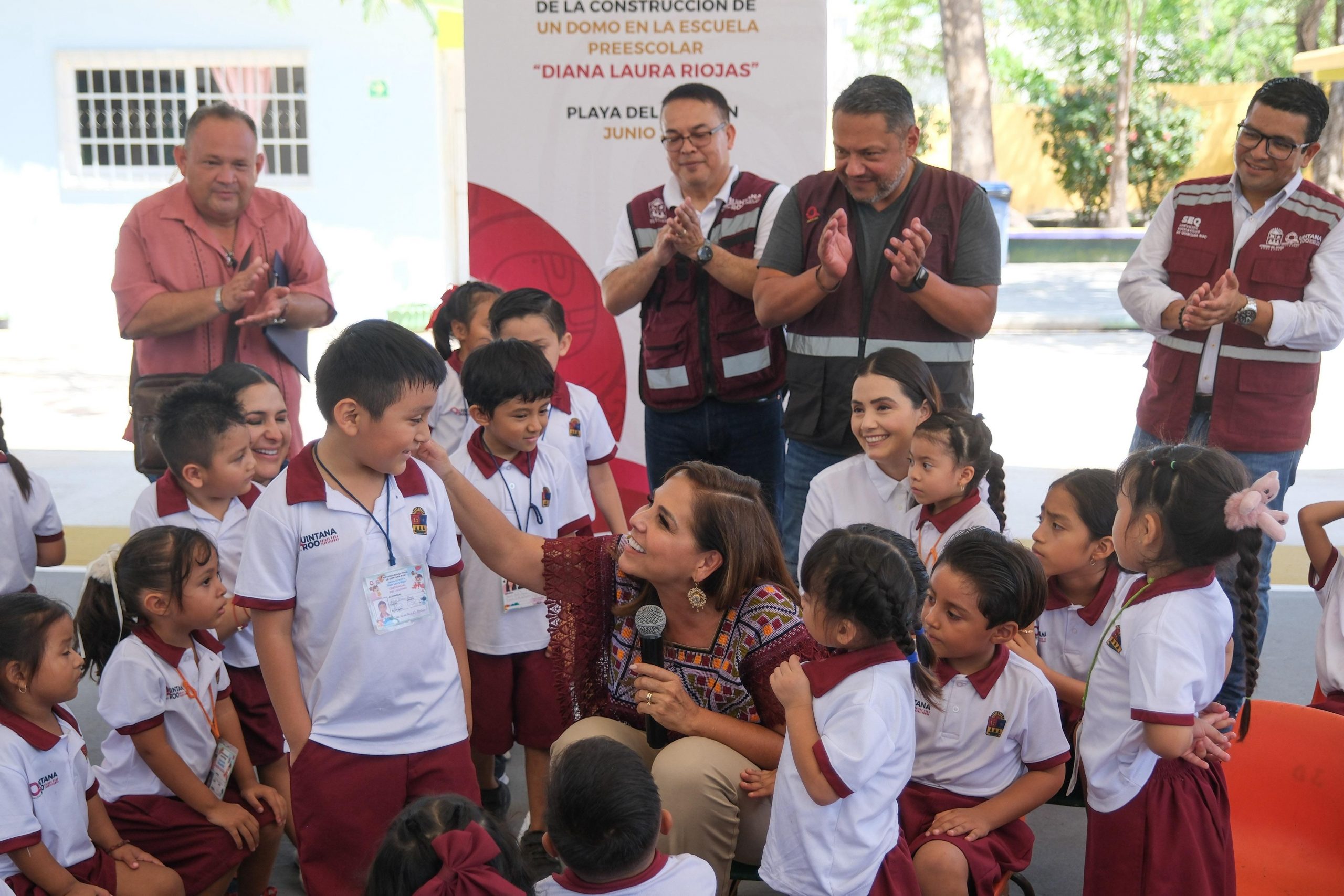 Rodeada de Niñas y Niños, en Ambiente Festivo, Mara Lezama Inaugura Domo en Preescolar “Diana Laura Riojas” en Playa del Carmen