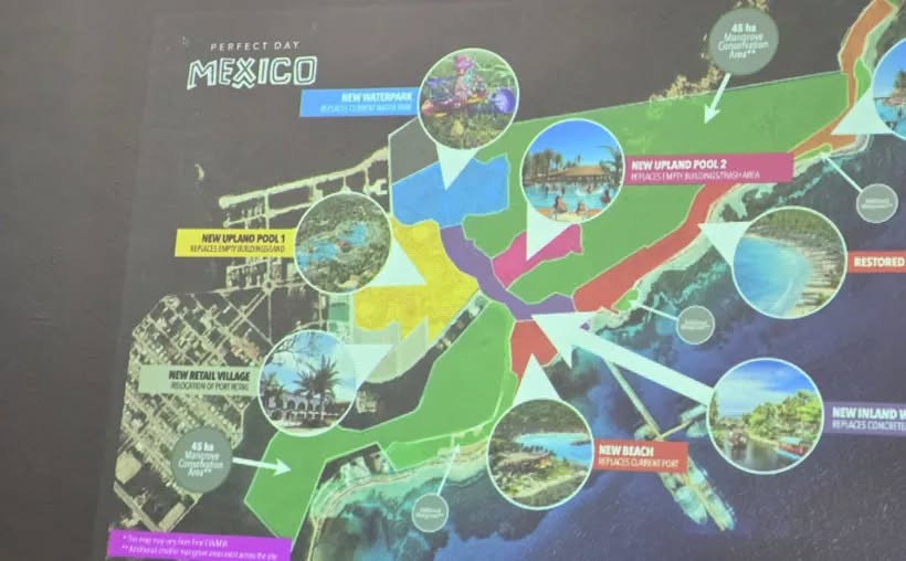 Royal Caribbean anunció desde 2024 este proyecto que implicará una inversión de más de 1,000 millones de dólares para desarrollar el complejo Perfect Day Mexico, que consiste en un desarrollo exclusivo de 90 hectáreas para los turistas que desciendan de sus cruceros en el puerto de Mahahual, el segundo más importante del país, ubicado al sur de Quintana Roo.