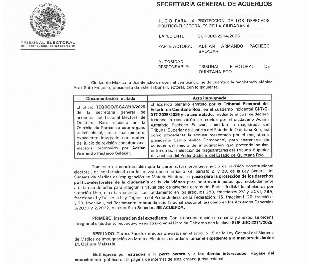 CHETUMAL, 7 de julio.- La Sala Superior del Tribunal Electoral del Poder Judicial de la Federación (TEPJF) admitió a trámite y turnó a instrucción la impugnación del excandidato a magistrado numerario Adrián Armando Pacheco Salazar, en la que pide incluir una vista al Ministerio Público contra el presidente del Tribunal Electoral de Quintana Roo (Teqroo), Sergio Avilés Demeneghi, en el acuerdo que lo declaró impedido para resolver los juicios de nulidad sobre la elección del Poder Judicial del Estado porque su esposa y su hermana son juezas electas.