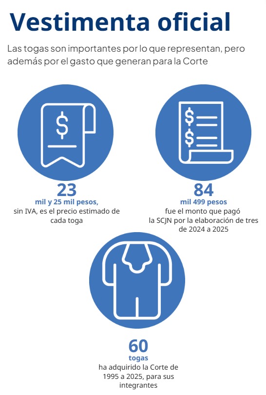 Mientras que en una respuesta fechada el 2 de junio de 2025, la Suprema Corte de Justicia de la Nación detalló que, tras un procedimiento de contratación identificado con la clave AD/MIN/DGRM/314/2023, se adquirieron tres togas mediante un contrato simplificado por un monto total de 84 mil 499.99 pesos.