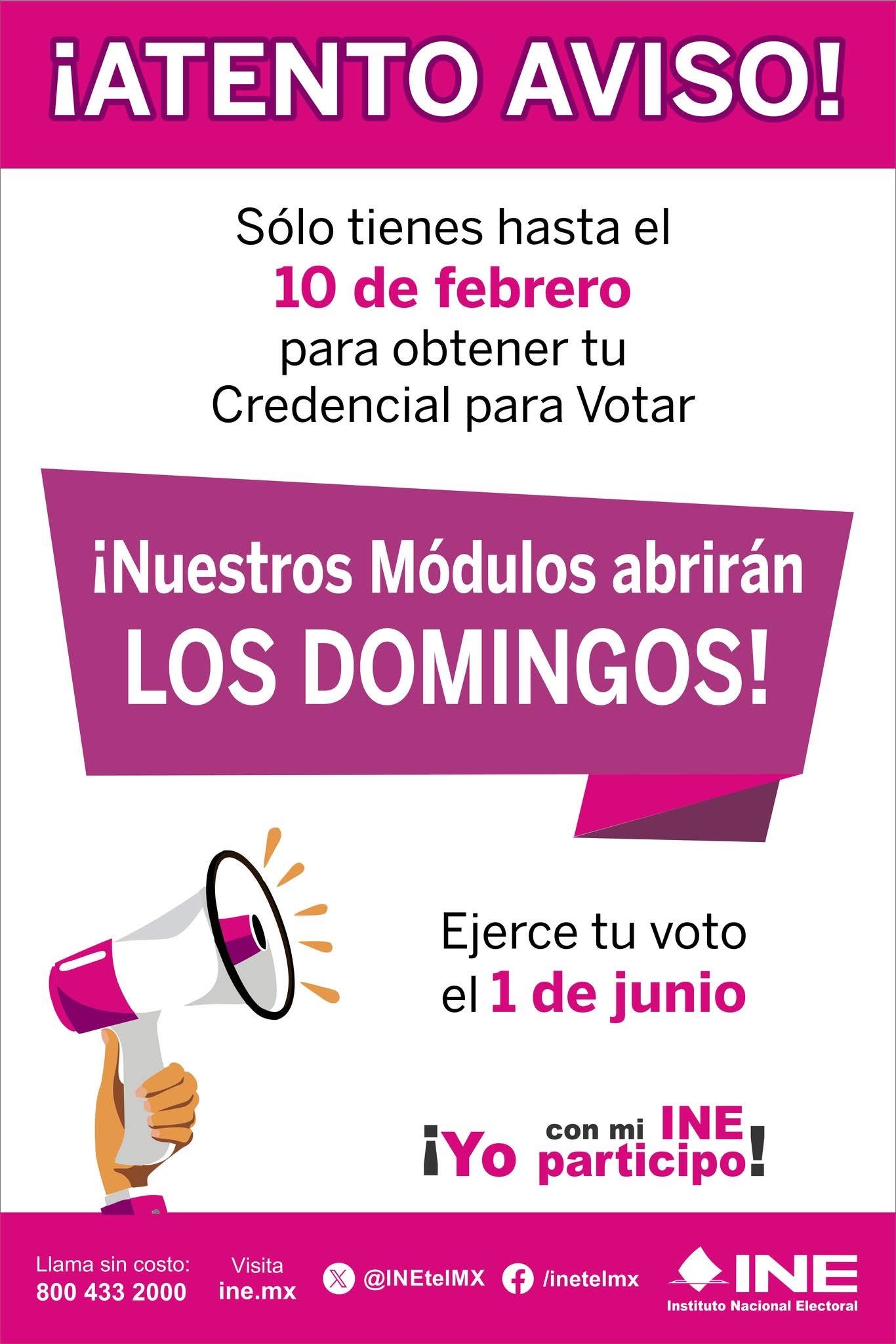 Mientras que para el 10 de febrero, último día del plazo para actualizar el domicilio en la credencial de elector o inscribir a jóvenes que vayan a cumplir 18 años de edad, los módulos fijos de atención, extenderán su horario de operación hasta las 10 de la noche.