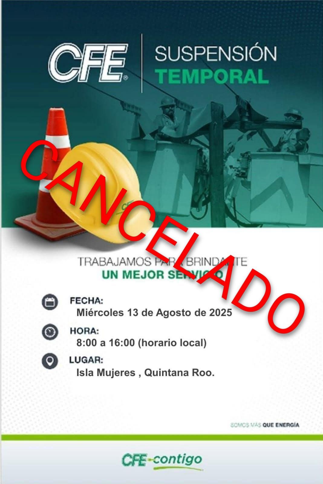 La CFE había anunciado a la comunidad, desde el pasado 06 de agosto, que el miércoles 13 de este mismo mes se suspendería de manera temporal el servicio de energía eléctrica en toda la isla, desde las 08:00 a las 16:00 horas y, en caso de registrase algún cambio, se notificaría a los usuarios.