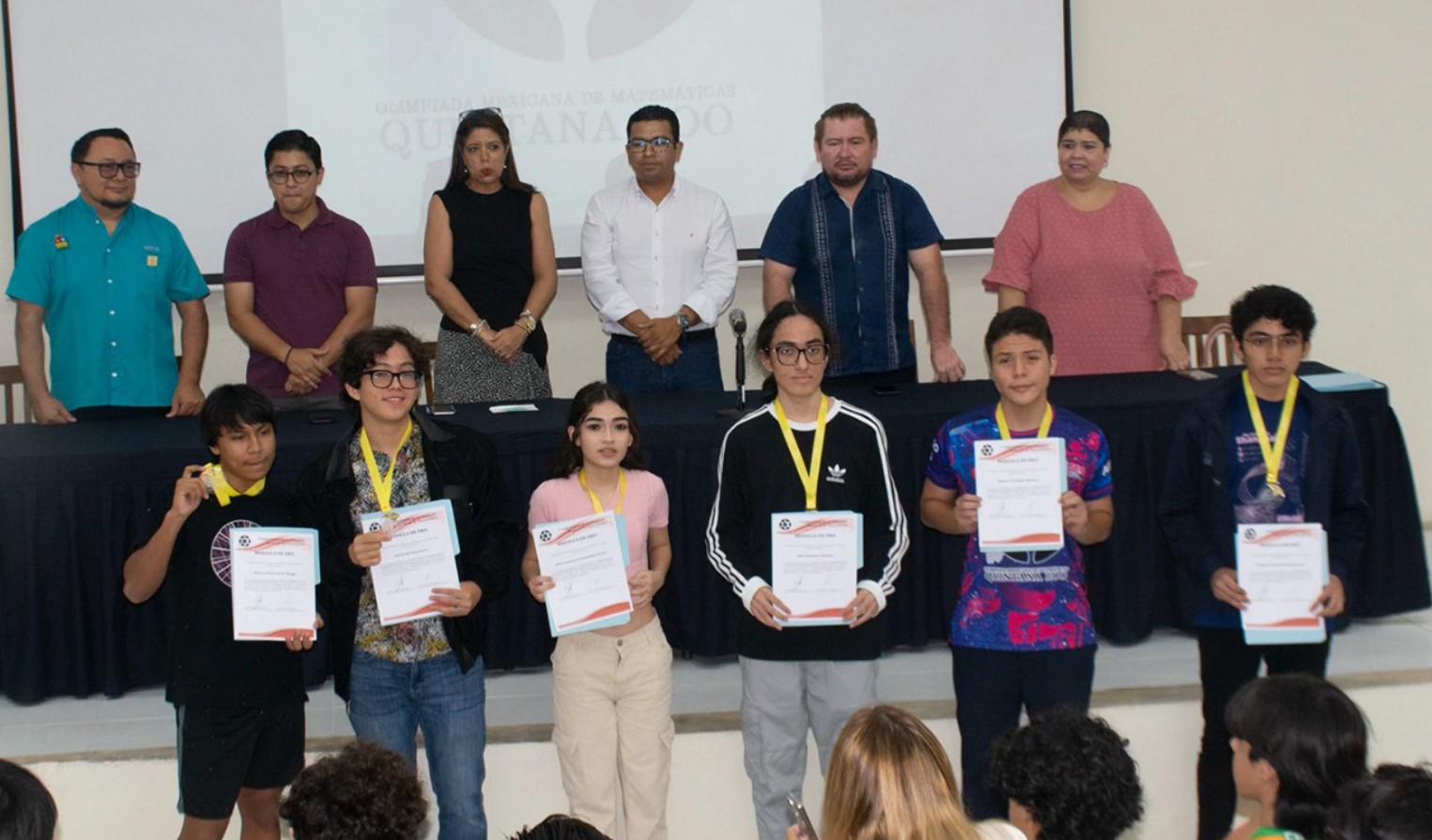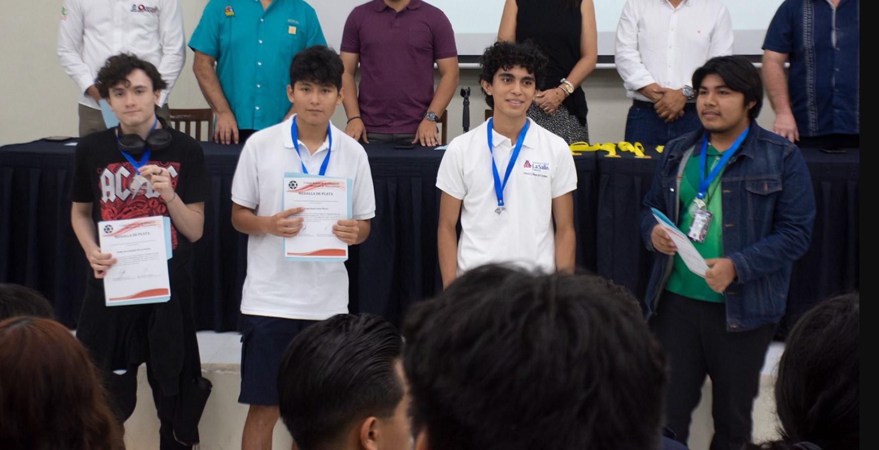 Estos son los estudiantes ganadores de medalla de oro Alier Sánchez y Sánchez, de la escuela Liceo; Sofía Santisteban Dávila, de la escuela Concientizarte; Luis Veudi Vivas Pérez, del Colegio de Bachilleres Chetumal; Mauricio Alexis Ortiz Villegas, del Colegio de Bachilleres Cozumel; Leandro Armando Che Gutiérrez, del Colegio de Bachilleres Plantel Bacalar; y Alfonso Yael Rojas Machuca, del Colegio de Bachilleres Plantel Cancún Uno; así como los estudiantes ganadores de la medalla de plata Óscar Lorenzana Ríos, de la preparatoria La Salle Playa del Carmen; Ingrid Arenas Carreto, del Cecyte Cancún 4; Margarita Chichipa, del Tec Milenio; Pablo Arredondo de La Garza del Apex Centre; Jorge Juan León Pérez, de la preparatoria La Salle Playa del Carmen; yCarlos Daniel Chan Oliva, del Conalep 102 Felipe Carrillo Puerto.