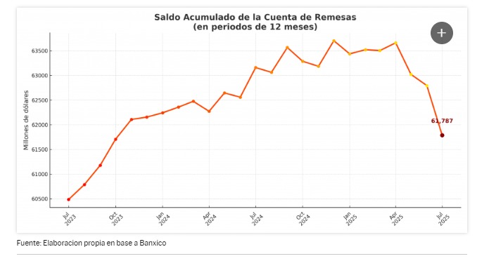 El informe del Banco de México también refleja que, con esta nueva caída, el superávit de la cuenta de remesas -la diferencia entre lo que entra y lo que sale del país- bajó a 5,088 millones de dólares, un recorte de mil millones respecto a junio de 2024. En el acumulado del primer semestre, el superávit fue de 28,989 millones de dólares, también por debajo del mismo periodo del año anterior.