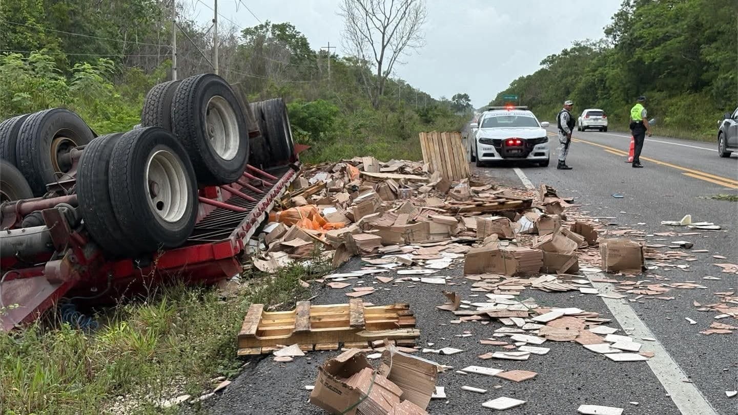 FELIPE CARRILLO PUERTO a 19 de junio.— Un accidente vial registrado la tarde de este jueves en la carretera federal 307, a la altura del kilómetro 130+000, generó una intensa movilización de cuerpos de seguridad, luego de que un remolque cargado con vitropiso se desprendiera de un tráiler en movimiento y terminara volcado a un costado de la vía, dejando parte de la carga regada sobre uno de los carriles.
