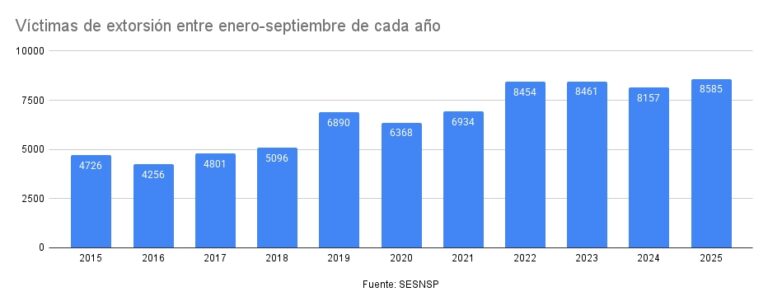El Secretariado Ejecutivo del Sistema Nacional de Seguridad Pública (SESNSP) reportó 8,585 víctimas de extorsión entre enero y septiembre de 2025, lo cual implica un aumento de 5.2 % respecto al mismo periodo del año pasado.