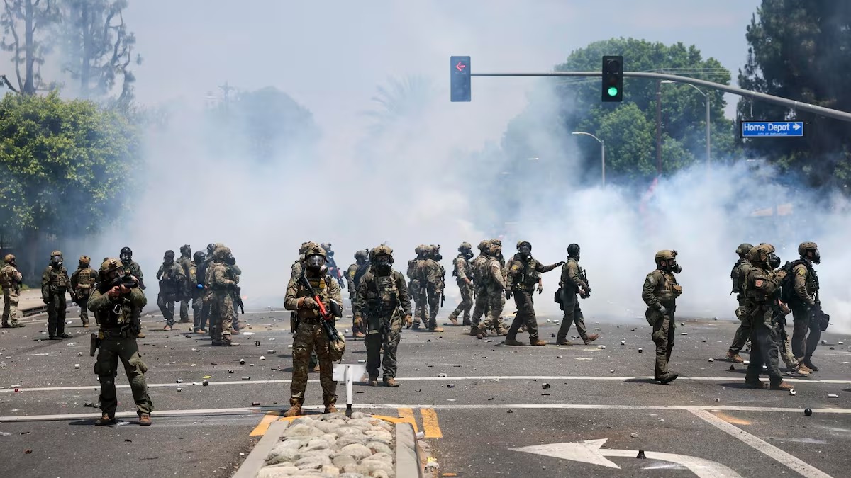 En Paramount, California, a unos kilómetros del centro de Los Ángeles, los manifestantes se enfrentaron con agentes federales de migración después de que se llevaron a cabo al menos dos redadas de migración el sábado, incluida una en Home Depot y otra en una instalación empacadora de carne cercana.