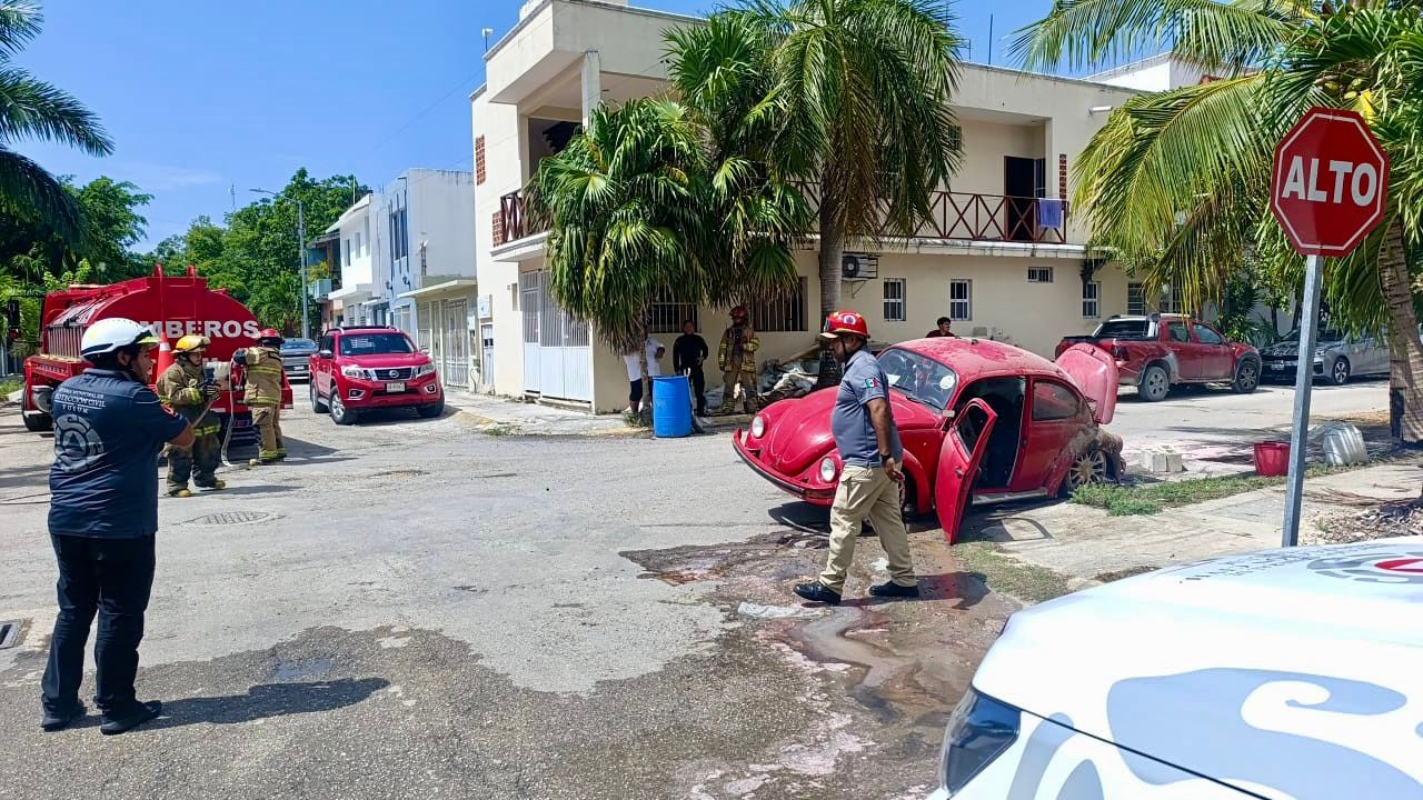 TULUM a 22 de junio.— Un automóvil tipo Volkswagen Sedan, conocido como “vocho”, se incendió en el cruce de la calle 2 Poniente con calle Escorpión, en la colonia Guerra de Castas, generando momentos de alarma entre los vecinos debido a la cercanía de estructuras de madera y otros vehículos estacionados en la zona.