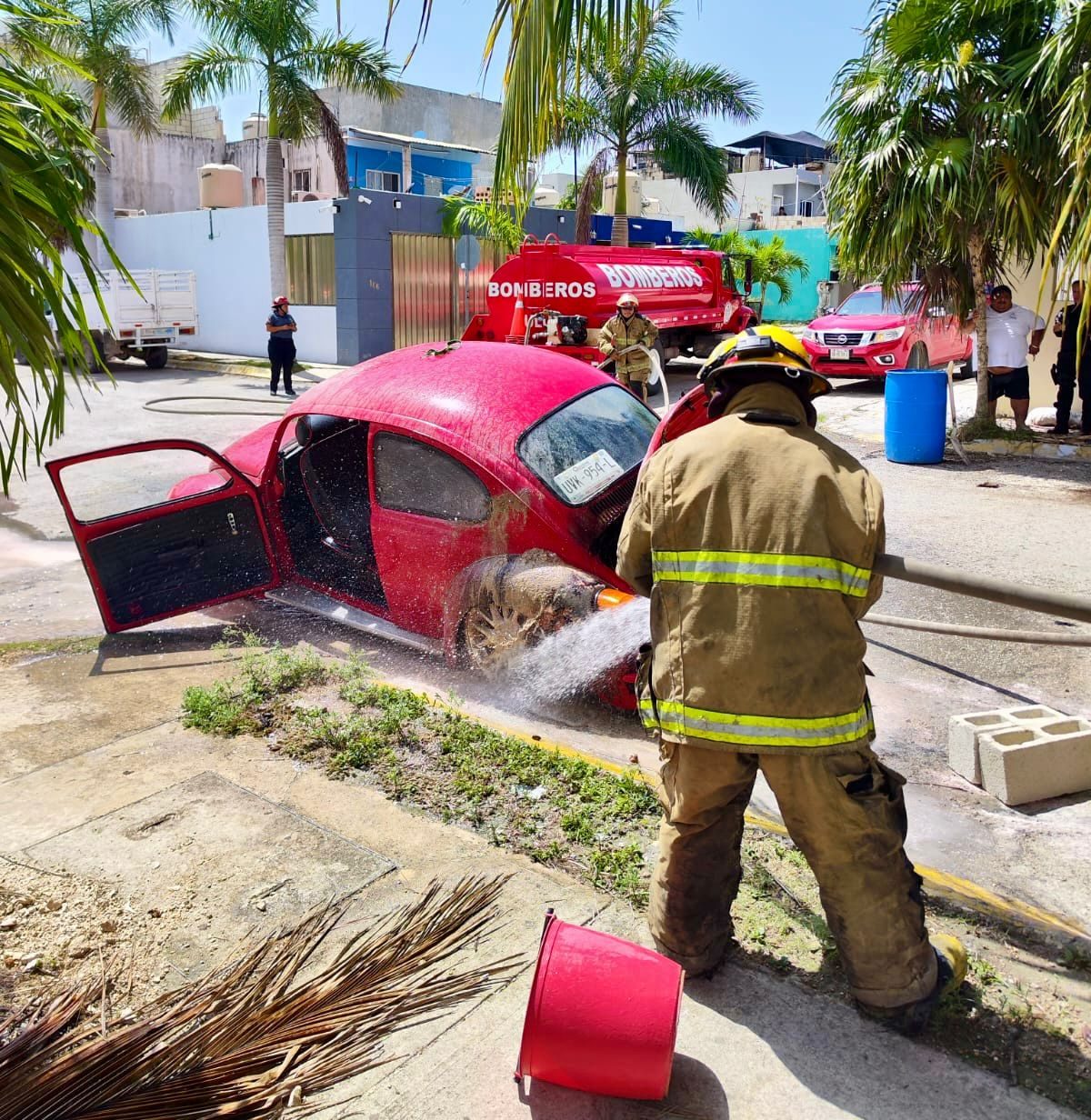 De acuerdo con los primeros reportes, el fuego se originó en la parte trasera del automóvil, de color rojo, mientras permanecía detenido. Las llamas comenzaron a expandirse rápidamente, lo que puso en riesgo una palapa cercana y al menos otro vehículo que se encontraba a pocos metros del lugar del siniestro.
