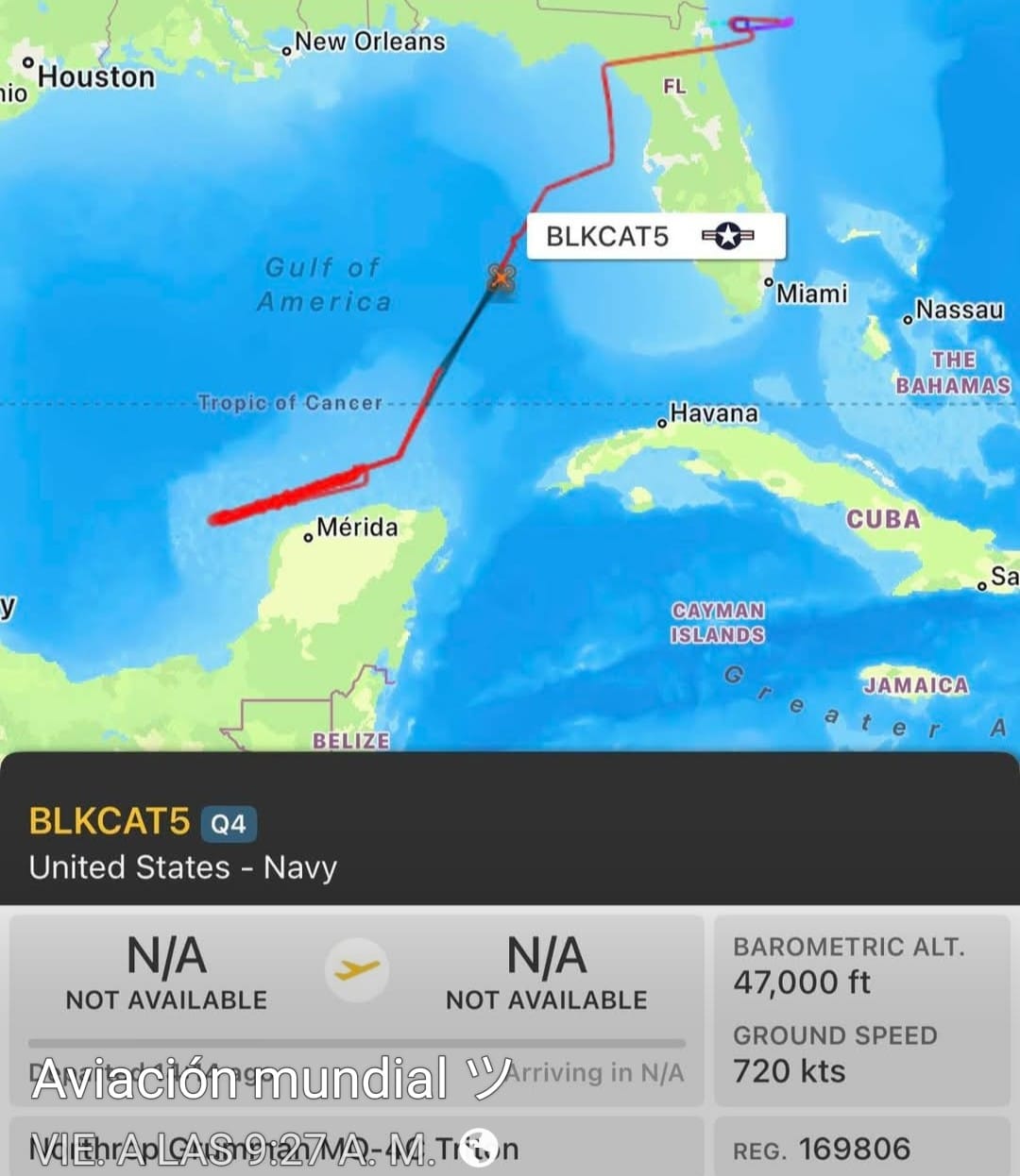 El dron de alta altitud MQ-4C Triton de la Marina de EE. UU., indicativo BLKCAT5, regresó a Naval Station Mayport (Florida) tras realizar una misión de patrulla sobre el Golfo de México, frente a la costa de la Península de Yucatán, según se reportó hace dos días.