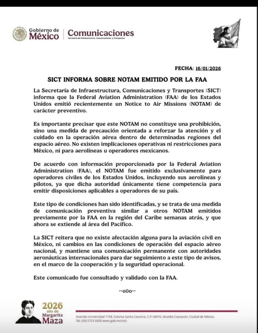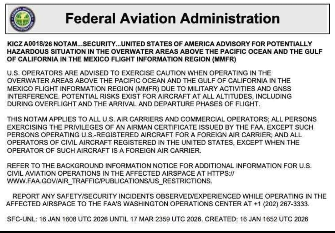 De acuerdo al diferentes fuentes y a la autoridad aeronáutica de los Estados Unidos, una alerta se emitió desde el pasado viernes a través de varios NOTAM’s (Aviso a las tripulaciones), por actividades militares las cuales señalan posibles peligros sobre territorio mexicano en particular secciones del Océano Pacífico y el Golfo de California, y citan “existen riesgos potenciales para las aeronaves en todas las altitudes, incluso durante el sobrevuelo y las fases de llegada y salida del vuelo”. Los avisos se aplicaron a todas las compañías aéreas y operadores comerciales de EE. UU., dijo la FAA.