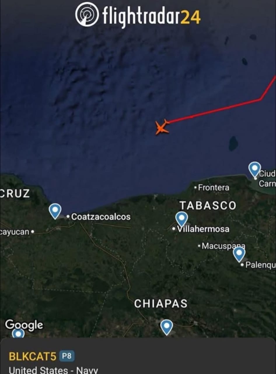 En la jornada de ayer viernes, Aproximadamente a la media noche un avión de la marina de Estados Unidos, un P8 -A poseidon ( avión de rastreo y guerra submarina ) volo sobre los límites de la costa mexicana, desde Yucatán hasta Veracruz .