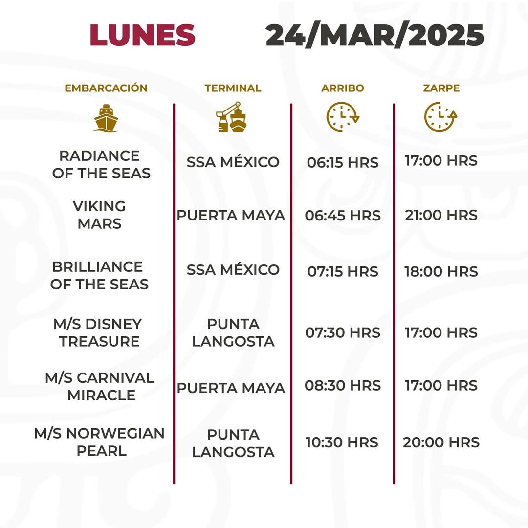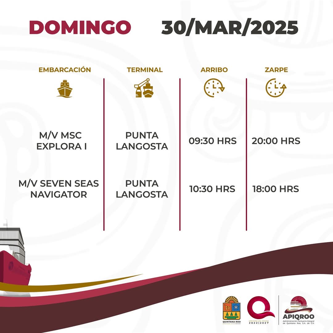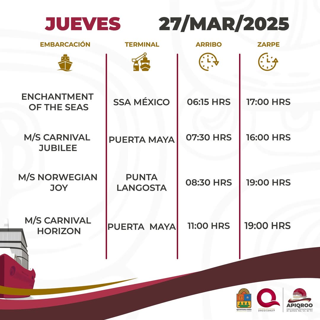 En esta ocasión, el muelle Puerta Maya será el que registrará mayor actividad con 15 atraques, con tres casas llenas, seguido por el céntrico Punta Langosta con 11, con cuatro casas llenas. Asimismo, en el SSA México llegarán 10 hoteles flotantes con cuatro casas llenas.