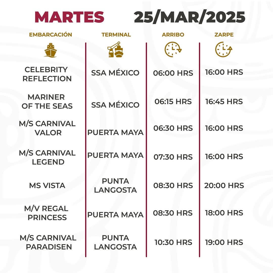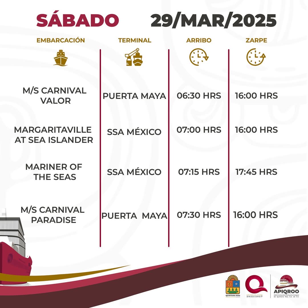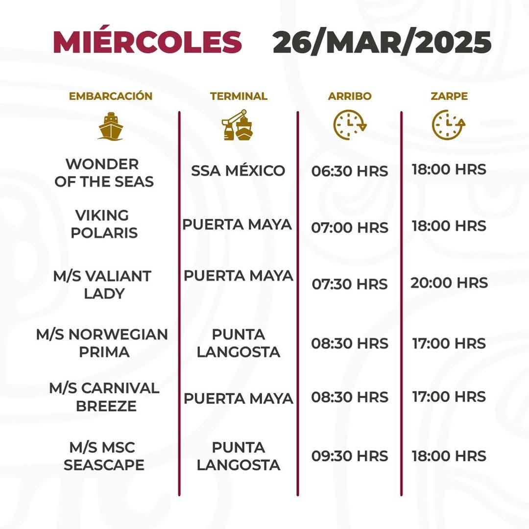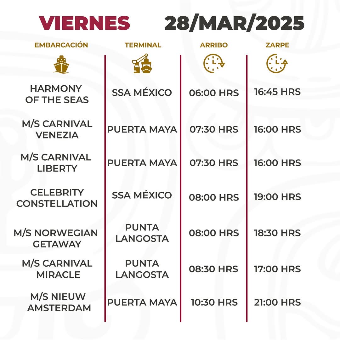 En esta ocasión, el muelle Puerta Maya será el que registrará mayor actividad con 15 atraques, con tres casas llenas, seguido por el céntrico Punta Langosta con 11, con cuatro casas llenas. Asimismo, en el SSA México llegarán 10 hoteles flotantes con cuatro casas llenas.