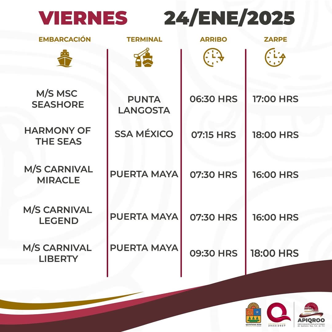 Esta vez el día de mayor actividad portuaria de gran calado serán el miércoles, cuando arribará la poco común cifra de  nueve colosos de los mares, con casa llena en los tres muelles internacionales, además de un fondeo y un crucero que permanecerá “al pairo. Seguido por el martes con siete, así como el lunes y viernes con cinco, además del jueves con cuatro. Mientras que en contraste, para el sábado y  domingo se contemplan únicamente dos atraques, respectivamente, para complementar el programa de arribos.