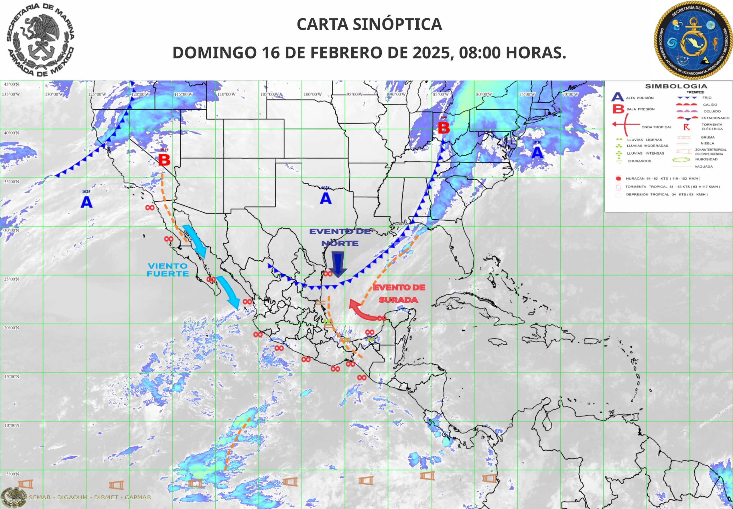 De manera general, el frente frío No. 27 recorrerá el oriente y sureste del territorio mexicano e interaccionará con un canal de baja presión sobre el sureste del país y con la entrada de humedad del mar Caribe.