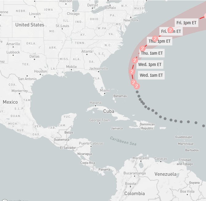 Una alerta de tormenta tropical se extiende actualmente desde el centro de la costa norte de Carolina del Norte, pasando por Kitty Hawk, incluyendo el estrecho de Pamlico. La alerta indica la posibilidad de vientos con fuerza de tormenta tropical (de 63 a 117 km/h) en las próximas 48 horas.