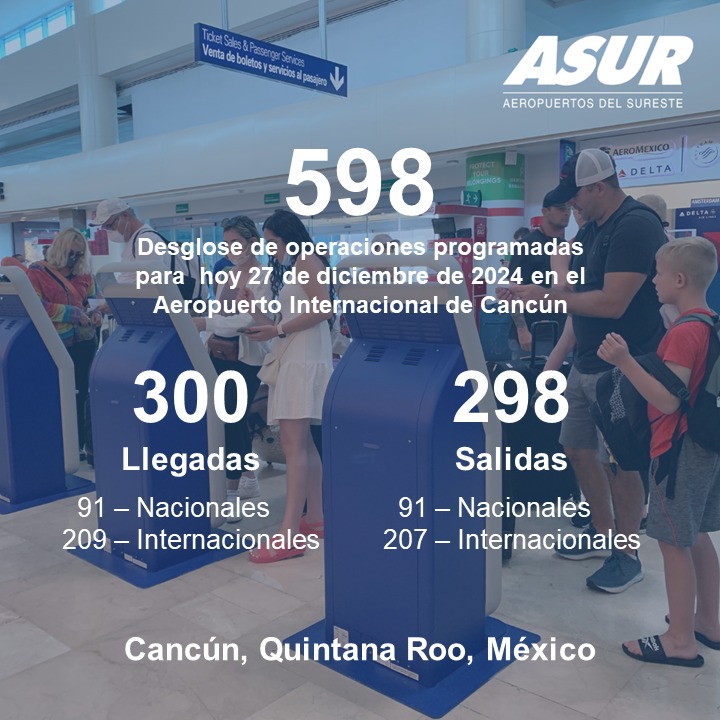 CANCÚN, Q.ROO, 27 de diciembre-. Programó el Aeropuerto Internacional de Cancún (AIC) un total de 598 operaciones este viernes y se espera desde el fin de semana una mayor afluencia de visitantes con motivo de los festejos para recibir al nuevo año.