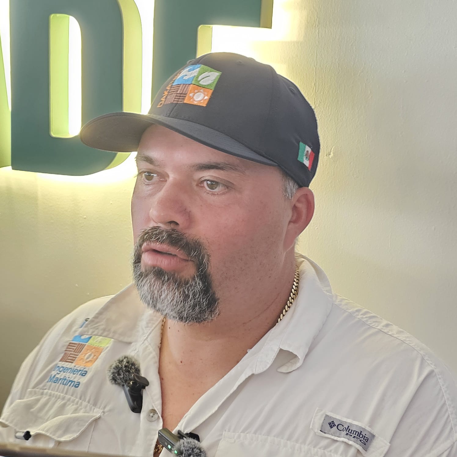 Playa del Carmen, a 26 de enero de 2025. – El director general de la empresa Dakatso de México, Dagoberto Ruíz anuncia proyecto piloto de la creación de barreras artificiales de arrecife de coral elaborado con “sargacreto” una aleación elaborada por la empresa.