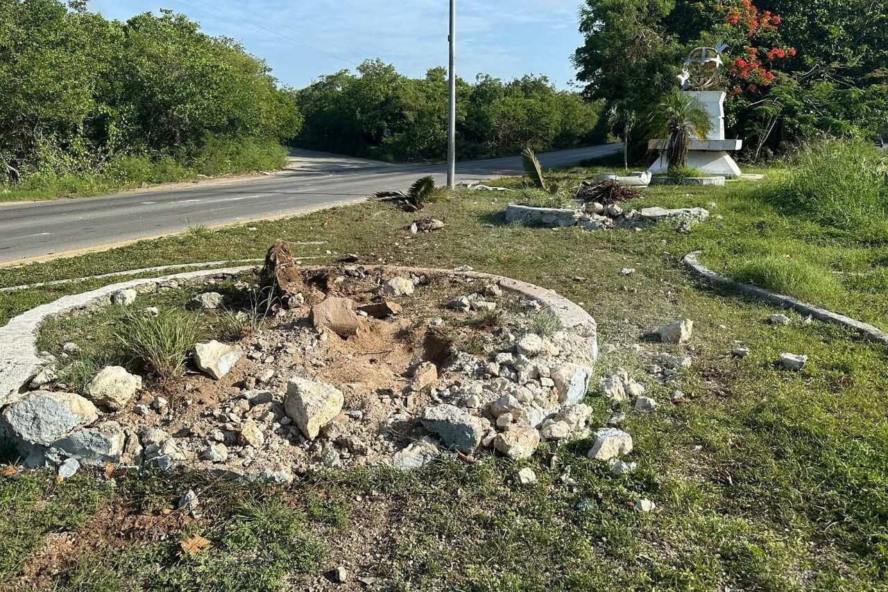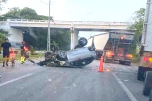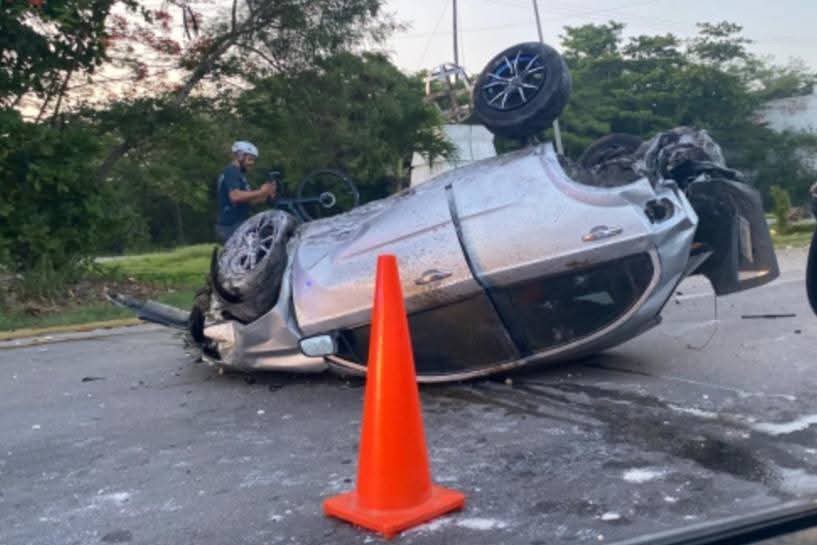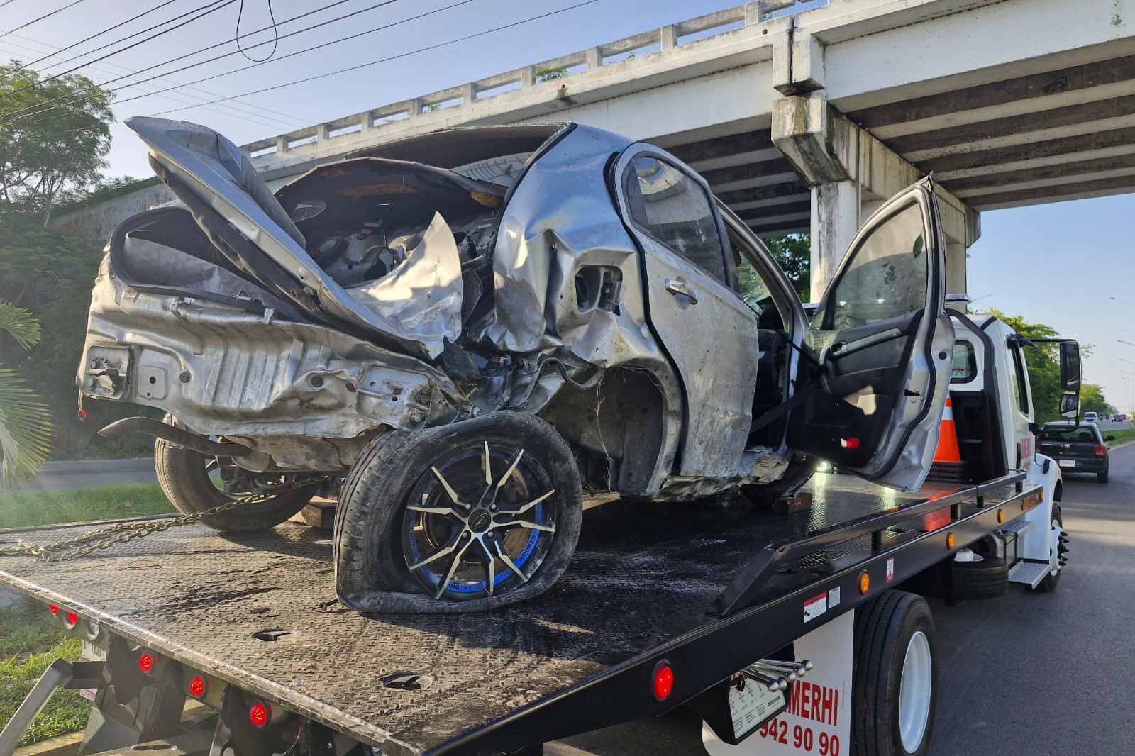 El vehículo al llegar a la curva de ingreso al puerto, que pasa debajo del puente hacia la antigua carretera a Chelem por alguna razón no hizo la curva y se fue de frente contra las decoraciones y palmeras en el sitio, destrozando todo a su paso y acabando su recorrido volcado sobre la vialidad en sentido opuesto de dicha carretera.
