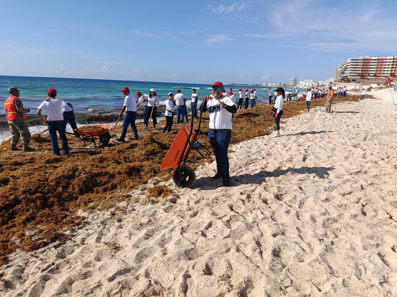 Integrantes del ejército Mexicano, soldados del Servicio Militar Nacional y mujeres voluntarias, realizan labores de apoyo en la playa Delfines, localizada sobre el Boulevard Kukulcán, en la zona hotelera de Cancún, como parte de un esfuerzo conjunto con autoridades de los tres órdenes de gobierno.