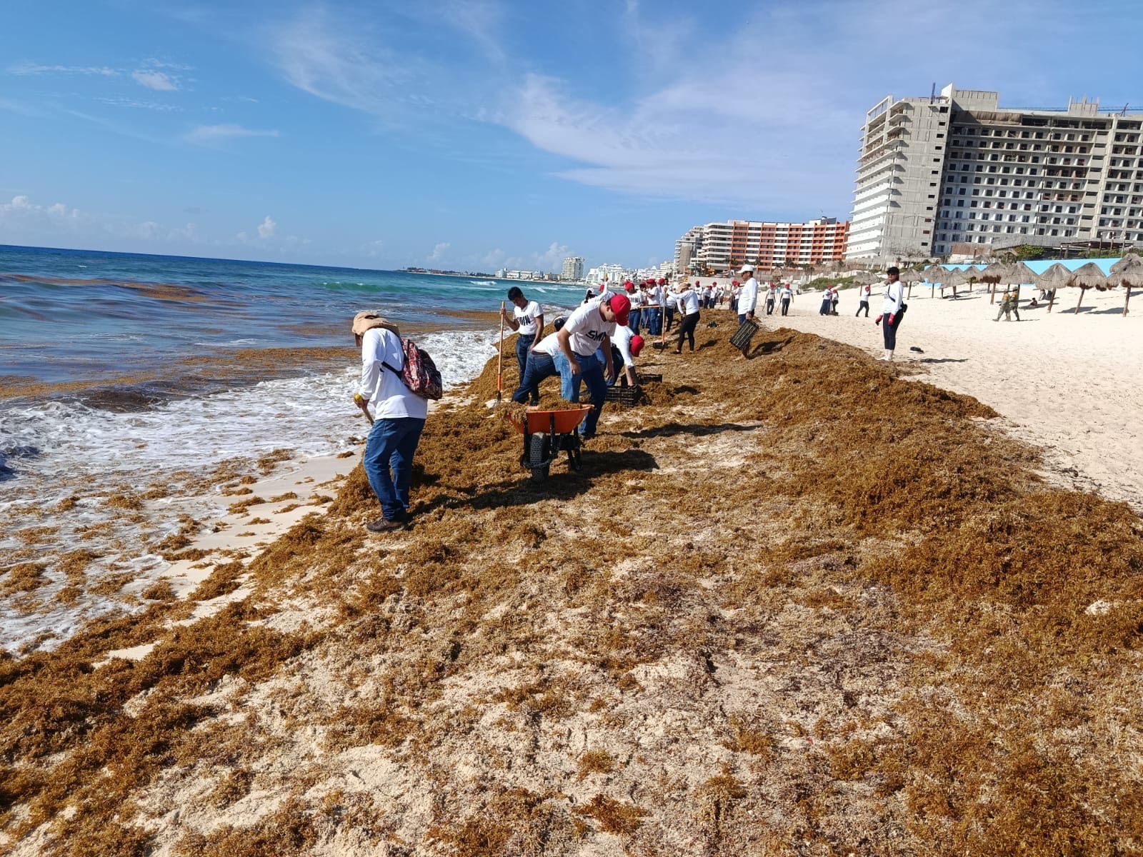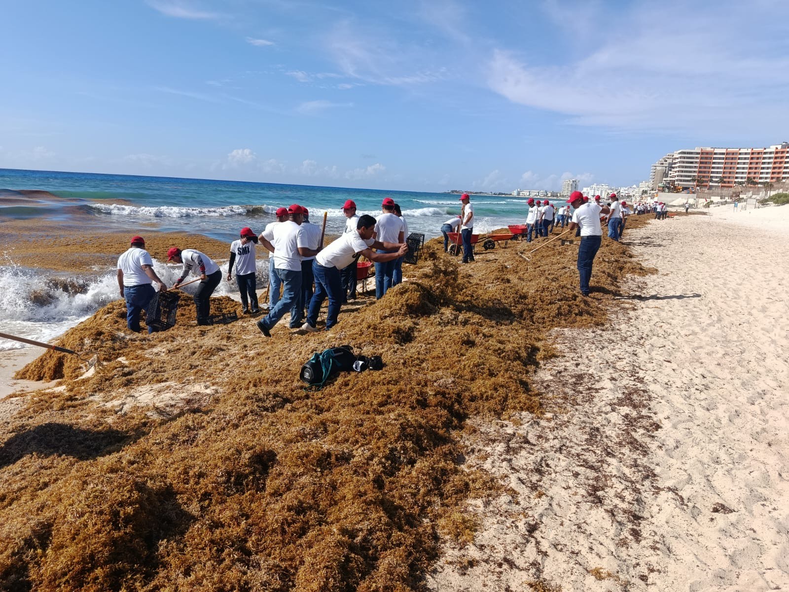 Retiro manual y mecánico de sargazo acumulado en la franja costera.