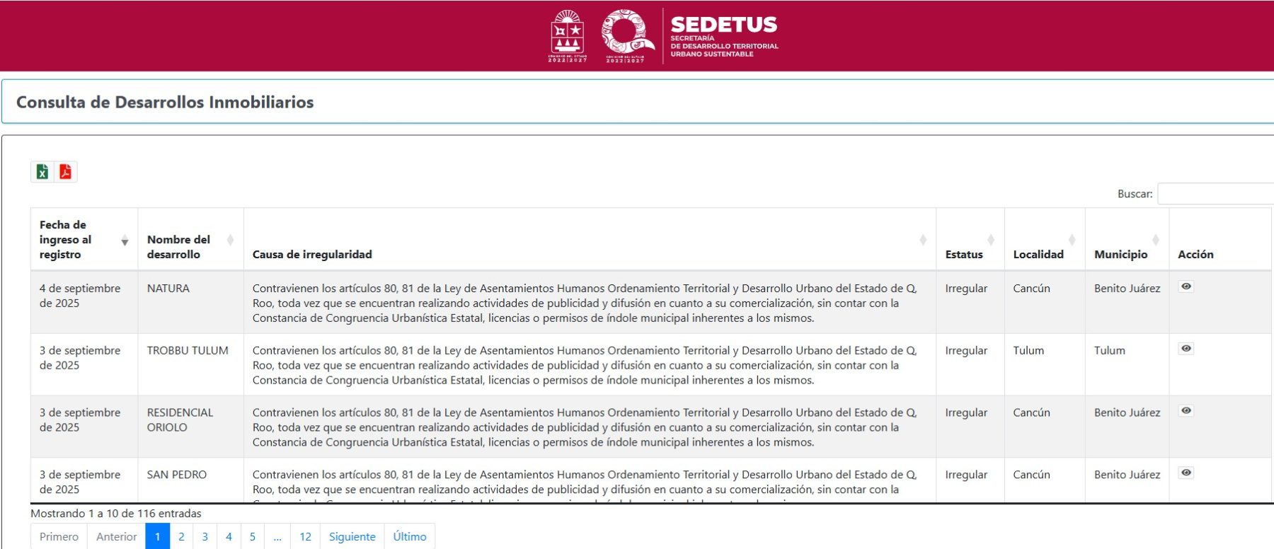 CHETUMAL, 9 de octubre.- La Secretaría de Desarrollo Territorial Urbano Sustentable de Quintana Roo (Sedetus) ha llegado al registro de 116 proyectos y desarrollos inmobiliarios que se comercializan en Quintana Roo, tras cinco meses de haber iniciado la publicación de las alertas para evitar que la ciudadanía caiga en fraudes.