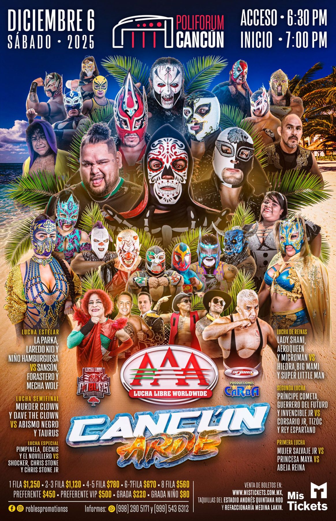 Es así como ha quedado conformado el cartel de -Cancún Arde- para el próximo 6 de diciembre en el “Poliforum Cancún”, por lo que los amantes al pancracio y a la AAA podrán adquirir sus boletos a partir de este sábado 25 de octubre en www.mistickets.com vía electrónica o bien de manera presencial en las taquillas del Estadio “Andrés Quintana Roo” de la SM 21 y en Refaccionaria Medina de la Avenida Lakin.