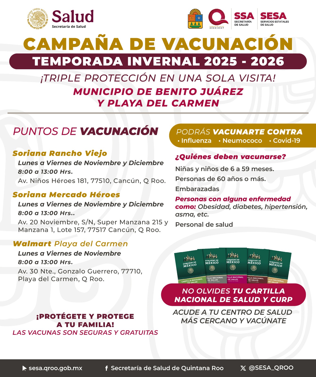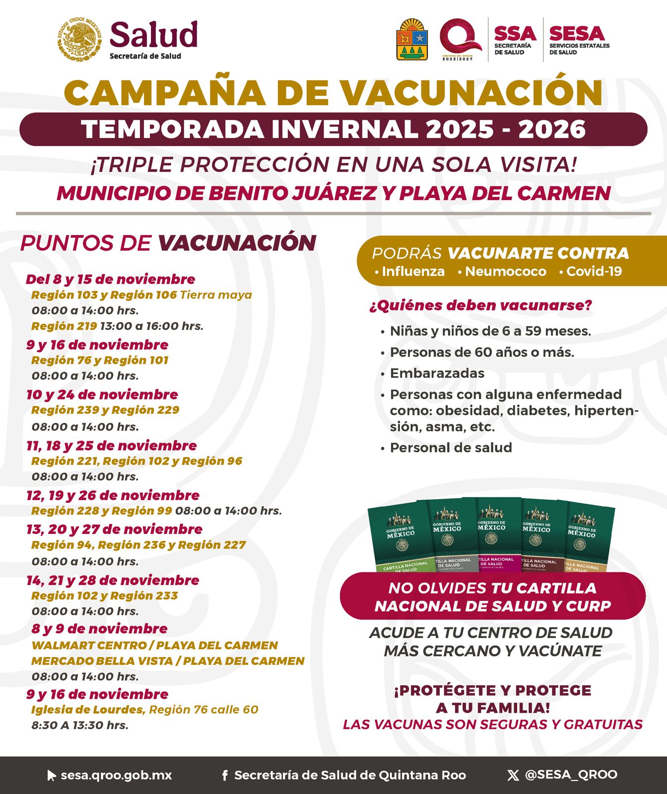 Cabe mencionar que durante el mes de noviembre está activa la Campaña de Vacunación Invernal 2025-2026, en la que se aplican vacunas contra Covid-19, influenza y neumococo a niñas y niñas de 6 a 59 meses; adultos de 60 años y más; embarazadas; personas con enfermedades crónicas como diabetes, hipertensión obesidad, asma y otras, y personal de salud, en centros de salud y puntos de vacunación en sitios públicos cuya ubicación publica la Sesa en sus redes sociales.