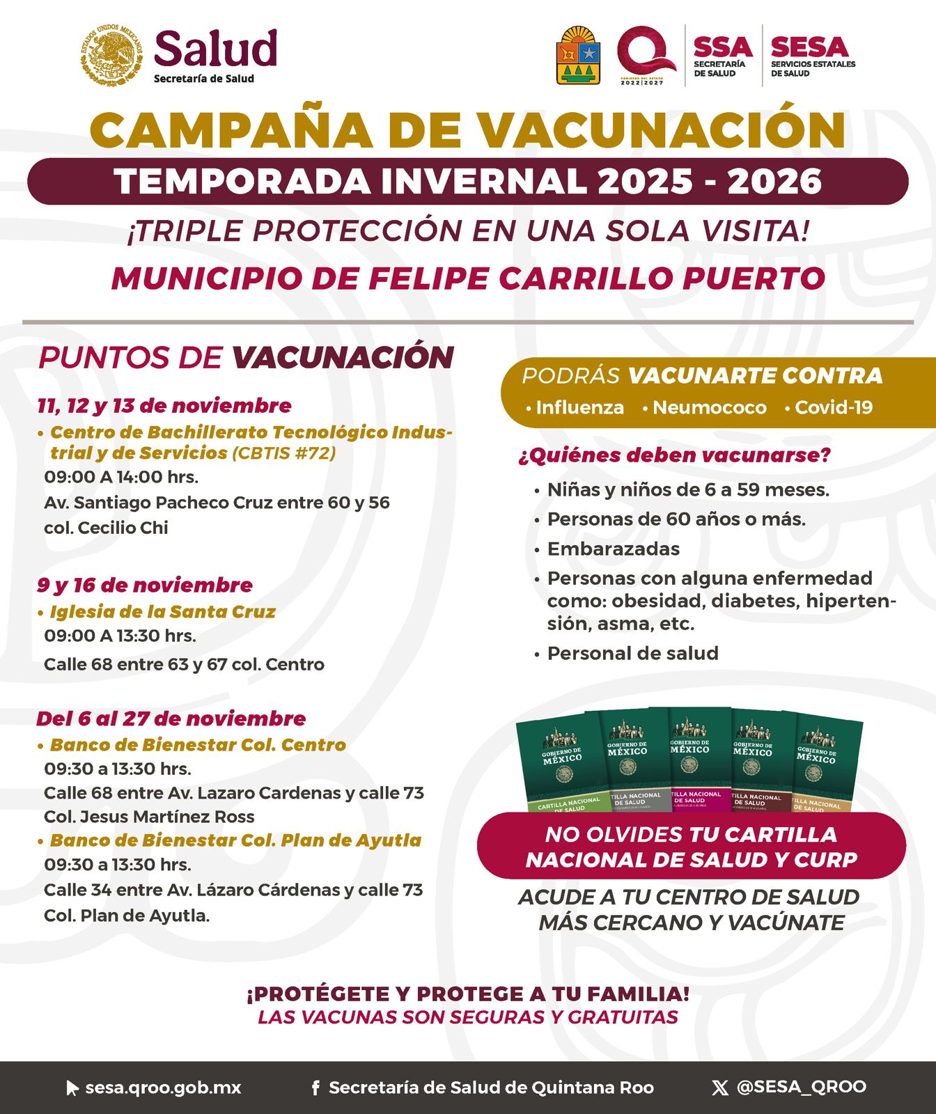 Cabe mencionar que durante el mes de noviembre está activa la Campaña de Vacunación Invernal 2025-2026, en la que se aplican vacunas contra Covid-19, influenza y neumococo a niñas y niñas de 6 a 59 meses; adultos de 60 años y más; embarazadas; personas con enfermedades crónicas como diabetes, hipertensión obesidad, asma y otras, y personal de salud, en centros de salud y puntos de vacunación en sitios públicos cuya ubicación publica la Sesa en sus redes sociales.