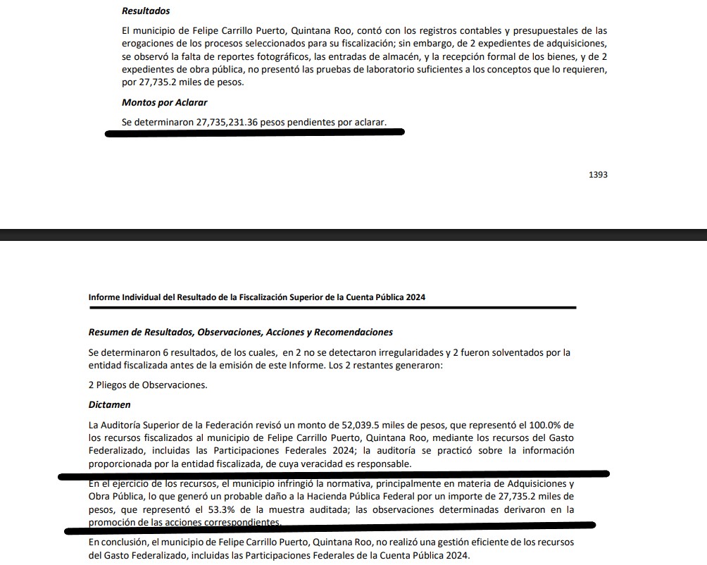 En su conclusión la ASF determinó que el municipio de Felipe Carrillo Puerto infringió la normativa, principalmente en materia de Adquisiciones y Obra Pública, lo que generó un probable daño a la hacienda pública federal por un importe que representó el 53.3 % de la muestra auditada, por la falta de reportes fotográficos, las entradas de almacén, y la recepción formal de bienes, y por no presentar las pruebas de laboratorio suficientes a los conceptos de dos contratos de obra.
