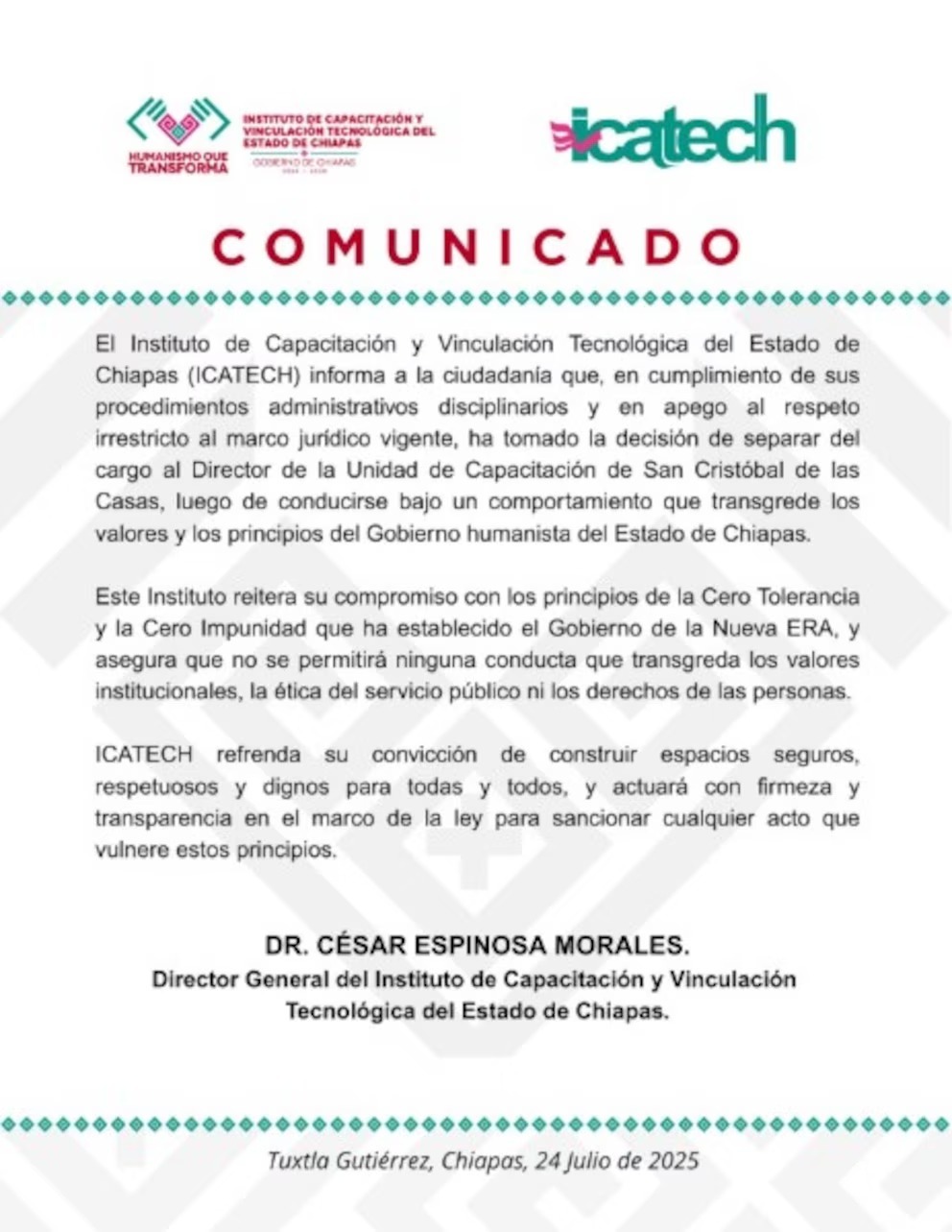 El comunicado señala que “en cumplimiento de sus procedimientos administrativos disciplinarios y en apego al respeto irrestricto al marco jurídico vigente, ha tomado la decisión de separar del cargo al Director de la Unidad de Capacitación de San Cristóbal de las Casas, luego de conducirse bajo un comportamiento que transgrede los valores y los principios del Gobierno humanista del Estado de Chiapas”.